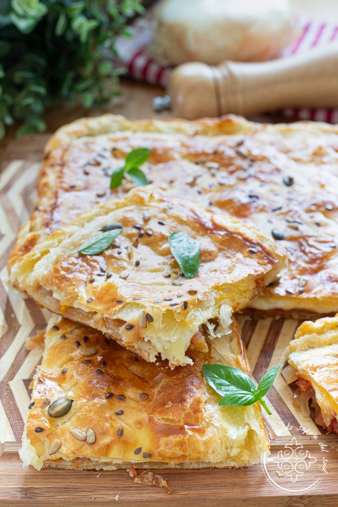 Wenn die Sauce gar ist, lasst sie abkühlen. Rollt dann den Blätterteig aus, verteilt die Zwiebel-Tomaten-Mischung darauf, legt anschließend die Käsescheiben und zum Schluss den geriebenen Caciocavallo darauf. Streut etwas Pfeffer darüber und legt die zweite Teigrolle als Deckel darauf.