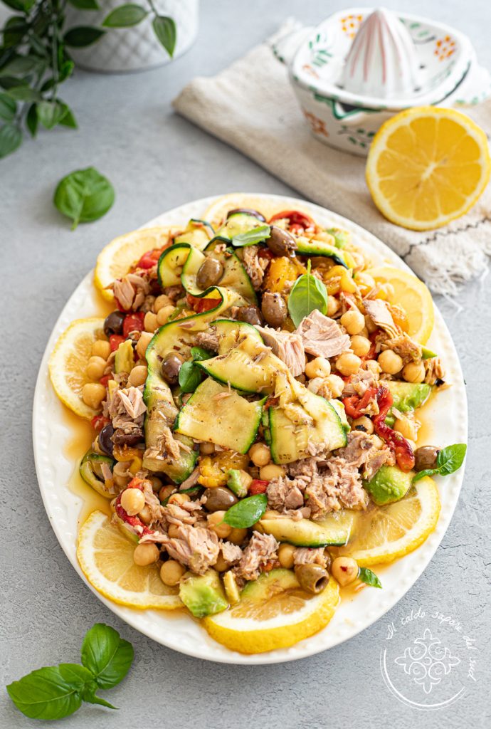Dann gibt es noch Oliven, cremige Avocado, optional Thunfisch – den könnt ihr weglassen oder durch Feta, hartgekochte Eier oder was ihr sonst bevorzugt ersetzen – und der Duft der Zitrone verbindet alles. Das Ergebnis ist ein reicher Salat mit gegrillten Zucchini, Paprika und Kichererbsen, ideal als Sommerrezept fürs Abendessen, aber auch als Idee für ein schnelles Mittagessen oder zum Mitnehmen.