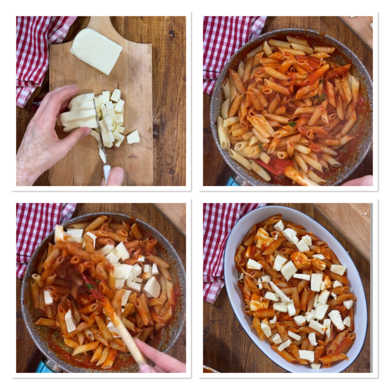 Die Hälfte der Pasta in eine Auflaufform geben, einige Mozzarellawürfel darauf verteilen, mit der restlichen Pasta bedecken, mit Parmesan bestreuen und noch ein paar Mozzarellawürfel darüber geben.