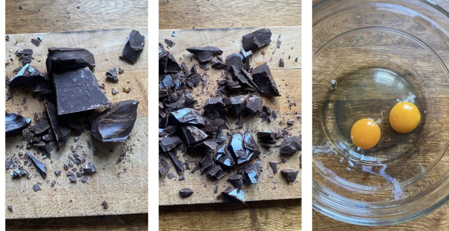 Für Omas Schokoladenkekse beginnt ihr damit, die Schokolade zu hacken. Während ihr weiterarbeitet, schmelzt ihr sie im Wasserbad oder in der Mikrowelle (bei 350 W und dabei alle 30 Sekunden umrühren, damit sie nicht verbrennt). Schlagt in einer Schüssel die zwei Eier auf.