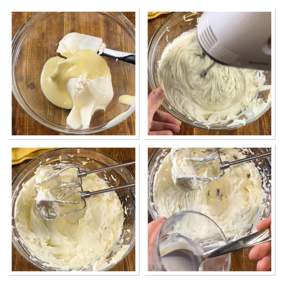 • Mascarpone in eine Schüssel geben und mit den Schneebesen zusammen mit Kondensmilch und Vanillezucker verrühren.