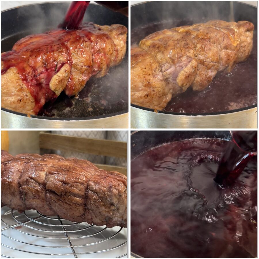 • Gießt das erste Glas Rotwein über das Fleisch, lasst es gut einziehen und gebt den Honig dazu. Kocht bei starker Hitze und begießt das Filet dabei ständig mit dem Weinfond. Sobald der Alkohol verdampft ist (das dauert etwa 3–4 Minuten), legt ihr das Fleisch auf ein Gitter und gebt ein weiteres Glas Wein in die Pfanne, nachdem ihr die Aromaten entfernt habt. Reduziert die Sauce, bis sie eingedickt ist. Bei Bedarf mit Salz abschmecken.