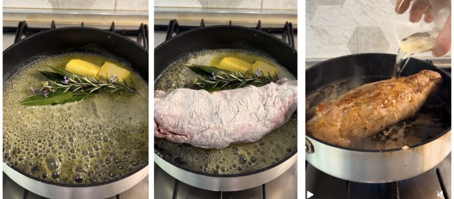 • Rosmarin und Lorbeer hinzufügen, dann das Filet hineinlegen und bei hoher Hitze rundherum anbraten, dabei wenden, damit es gleichmäßig Farbe bekommt. Achte darauf, das Fleisch auf keinen Fall zu durchstechen. Wenn das Filet gleichmäßig goldbraun ist, den Wein angießen und den Alkohol vollständig verdampfen lassen.