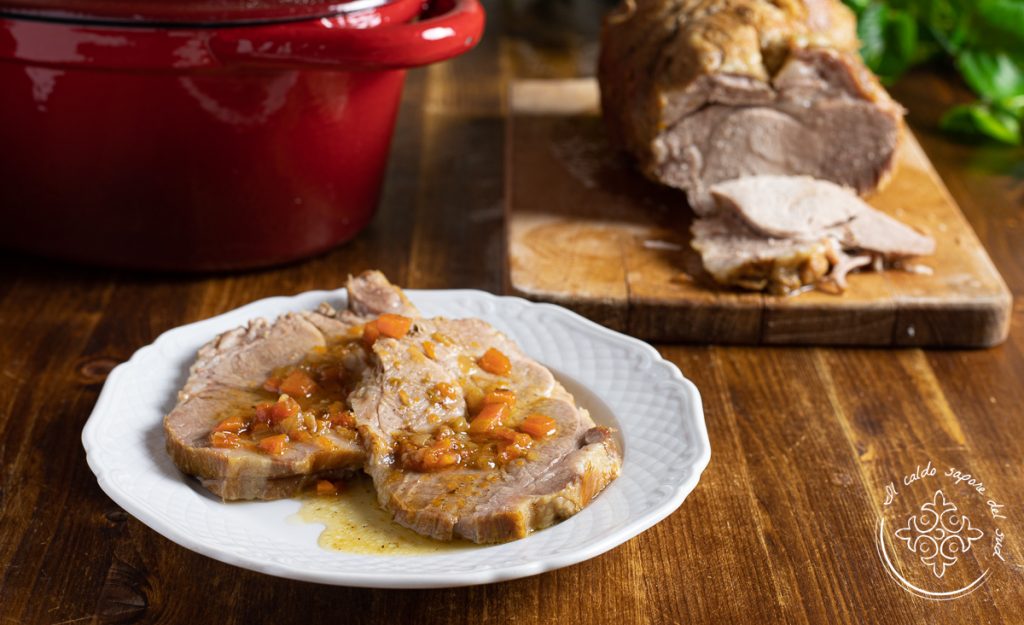 Schweinenacken in Bier, im Topf gebratener Braten. Der Schweinenacken ist ein Stück Fleisch aus dem Nacken des Schweins, sehr vielseitig und mit Fettadern durchzogen; er kann zu Wurst verarbeitet werden und eignet sich auch wunderbar für zarte und saftige Braten im Ofen oder im Topf. Der im Topf gebratene Schweinenacken ist ein zartes und saftiges Fleischgericht, perfekt für Abende mit Freunden oder der Familie. Ich koche sehr gerne den Braten aus Schweinenacken mit Äpfeln und Orangen, aber vor Kurzem wollte ich das Rezept für einen Schweinebraten mit Bier ausprobieren, und zwar mit genau diesem Fleischstück. Das Ergebnis war ein zartes Schweinenackenbraten, das auf der Zunge zu zerschmelzen schien; der typische bittere Geschmack des Biers war nur leicht wahrnehmbar, störte überhaupt nicht und verlieh dem Fleisch ein feines, köstliches Aroma.