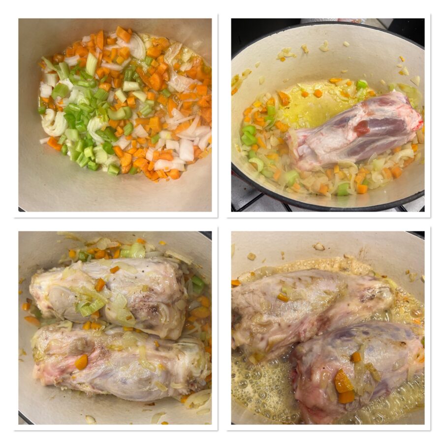 Schält, spült und schneidet die Zwiebeln und Karotten, entfernt die Selleriestangen von den Blättern und den härteren Fasern und hackt auch diese. Alles in einem großen, schwerwandigen Topf sammeln, gut umrühren und bei niedriger Hitze anschwitzen. Die Haxen dazugeben, von allen Seiten anbraten und das Bier zugießen; bei kleinster Hitze ca. 3 Std. 30 Min. garen.