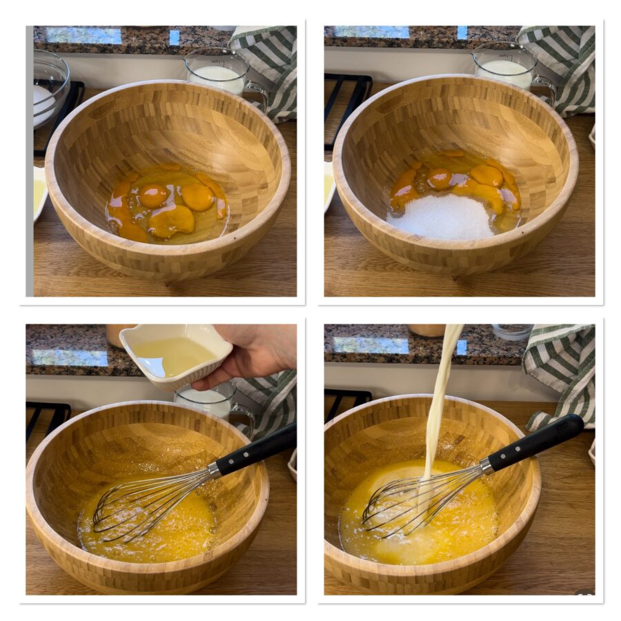 Für die gefüllten Pfannkuchen schlag die Eier (sie sollten Zimmertemperatur haben) in eine Schüssel, gib den Zucker dazu und verrühre alles kurz mit dem Schneebesen. Füge das Öl hinzu, rühre ein und gieße dann die Milch dazu. Vermische alles mit dem Schneebesen, dann siebe den Kakao hinzu.