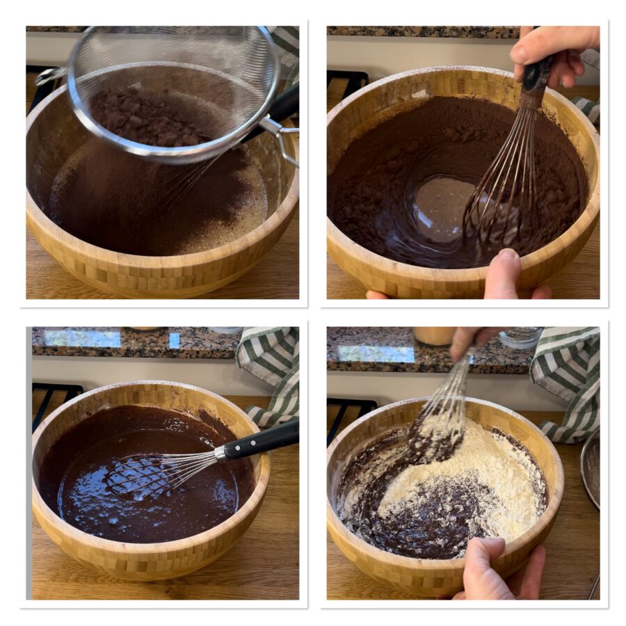 Sobald der Kakao eingearbeitet ist, siebe auch das Mehl hinzu. Rühre zu einer gleichmäßigen, klumpenfreien Masse und gib zum Schluss das Vanilleextrakt und das Backpulver dazu.