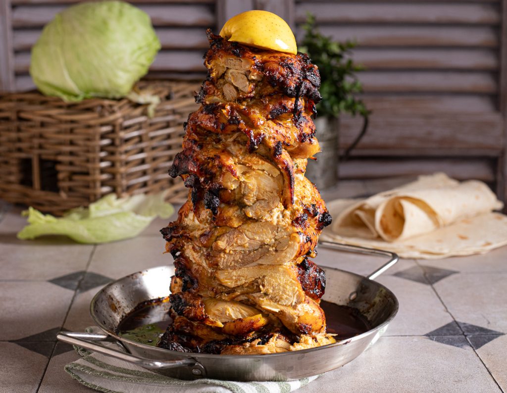 Das Hähnchenfleisch, Brust, Keulen und Oberschenkel wird mit Gewürzen und Aromen mariniert und dann langsam gegart, genau wie am Spieß: außen bildet sich eine würzige Kruste, innen bleibt es zart und saftig.