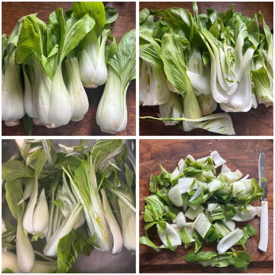 Wascht den Pak Choi gründlich unter fließendem Wasser, entfernt die harte Basis und trennt die Blätter voneinander.