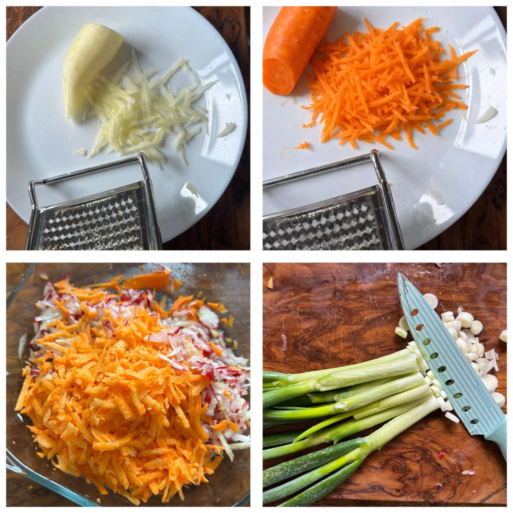 Reibt den Daikon (oder die Alternative) und die Karotten. Schneidet die Frühlingszwiebeln und den chinesischen Knoblauch fein und legt alles beiseite.