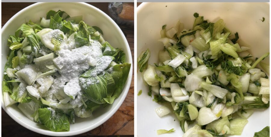 Schneidet den Pak Choi in nicht zu kleine Stücke, damit er nach der Fermentation fleischig und knackig bleibt. Gebt den Pak Choi in eine große Schüssel, fügt das Salz hinzu und massiert die Blätter vorsichtig. Lasst sie ruhen, bis sie Wasser freisetzen.
