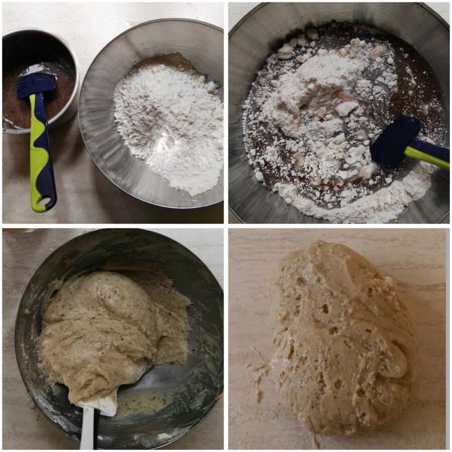 Wiegt die Zutaten ab und legt 50 g Zucker und 50 g Mehl beiseite. Bringt das Wasser zum Kochen, nehmt den Topf vom Herd und gebt die 250 g Zucker sowie die Gewürze hinein. Rührt um und lasst den Zucker so weit wie möglich auflösen. Gebt den Sirup zu 250 g Mehl. Knetet lange; macht euch keine Sorgen, wenn der Teig klebrig ist – jetzt ist der Moment, fast das gesamte Mehl und den Zucker hinzuzufügen. Knetet alles zu einer homogenen Masse; ihr erhaltet die auf dem Foto gezeigte Konsistenz. Gebt nicht mehr Mehl hinzu, sondern verwendet eine Spachtel, um den Teig zu handhaben und abzukühlen.
