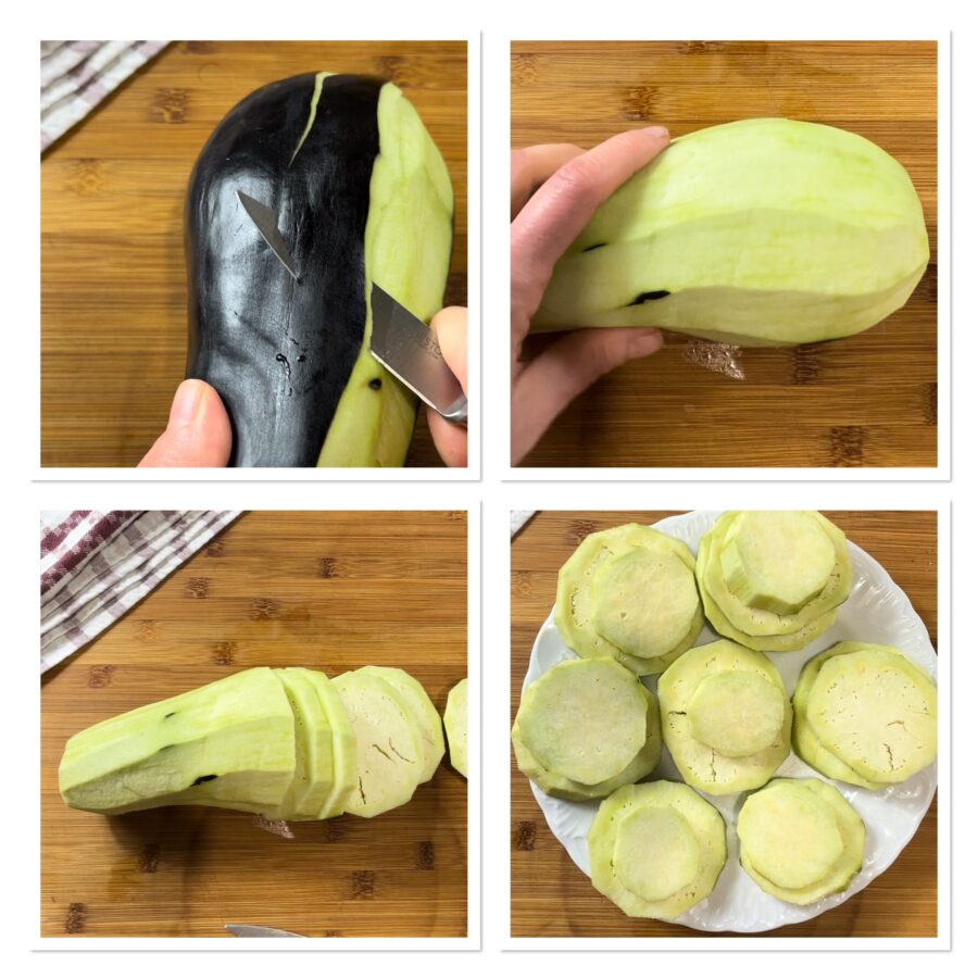 Für die Auberginen‑Schnitzel bevorzuge ich geschälte Auberginen, damit die Scheiben eine gleichmäßige Konsistenz haben. Viele nehmen die hellvioletten Sorten, weil sie zarter sind, aber ich verwende gerne sowohl die violetten als auch die dunklen Sorten.