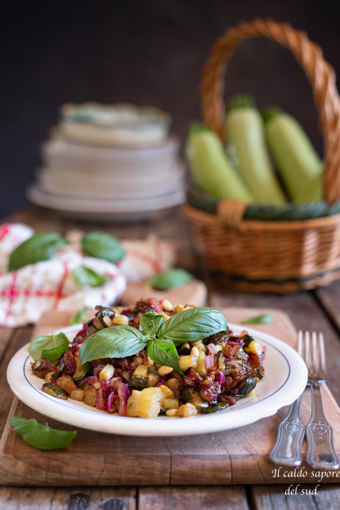 In diesem Rezept, inspiriert von einem typischen Gericht meiner Heimat, der Caponata, bereiten wir eine Beilage zu, die auch als sehr schmackhafter und feiner Antipasto passt, bei dem die Zucchini im Mittelpunkt stehen. Abgerundet wird alles mit Rosinen und Pinienkernen und einer süß‑sauren Note, die sie wirklich besonders macht.