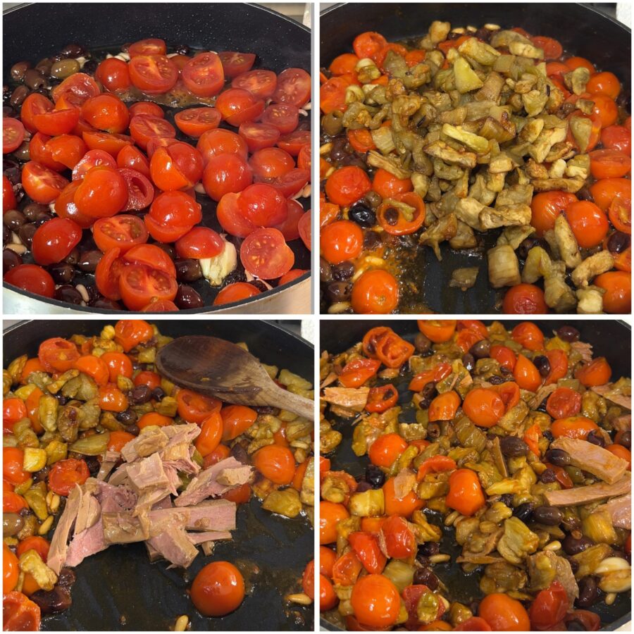 Alles ansäuern lassen, die Cherrytomaten waschen und halbieren, Salz anpassen und bei mittlerer Hitze etwa zehn Minuten kochen lassen. Die Auberginen gut abgetropft und trocken zugeben, vermengen und zuletzt die abgetropfte und zerkleinerte Thunfischbauch-Herstellung in Öl einrühren, die nur wenige Sekunden erwärmt werden sollte (bei frischem Thunfisch ein paar Minuten garen).