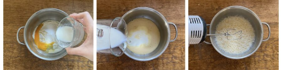 • Gebt 50 ml Milch hinzu und verrührt alles zuerst mit dem Handmixer. Dann die restlichen 200 ml dazugeben und die Creme fertig rühren.