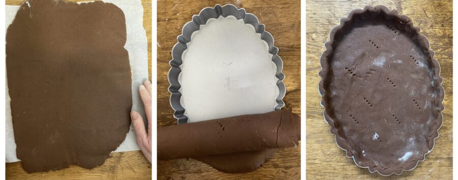 Bereitet den Kakao-Mürbeteig zu und lasst ihn 30 Minuten im Kühlschrank ruhen. Danach rollt ihr ihn zwischen zwei Backpapierblättern aus, damit er nicht klebt (bei Bedarf etwas Mehl verwenden).