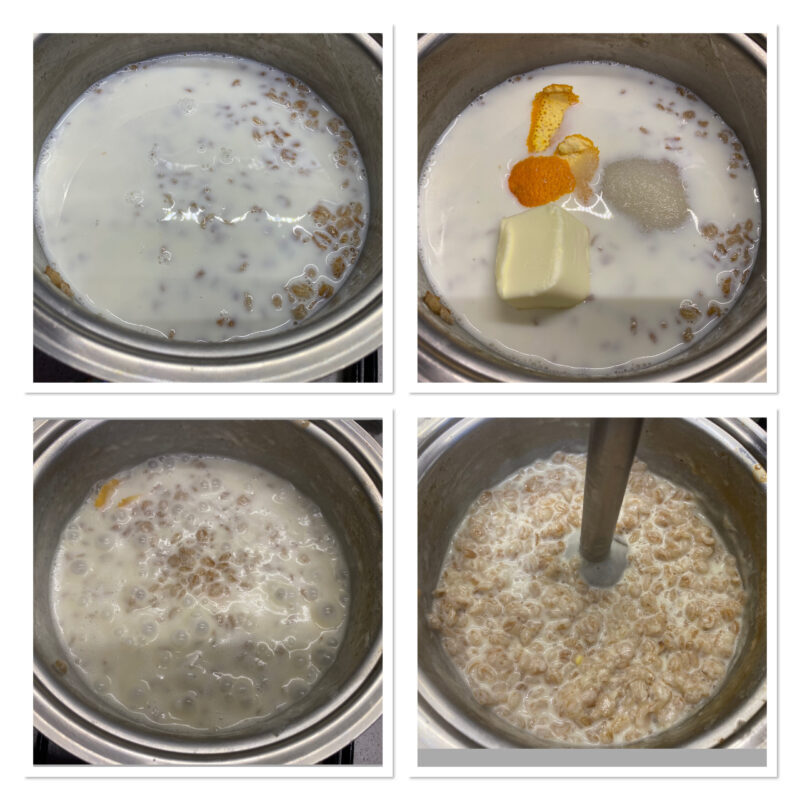 Geben Sie den vorgekochten Weizen in einen Topf, bedecken Sie ihn mit der Milch und fügen Sie Butter, zwei Esslöffel Zucker (vom Gesamtzucker) sowie Orangenschale und Zitronenschale hinzu.