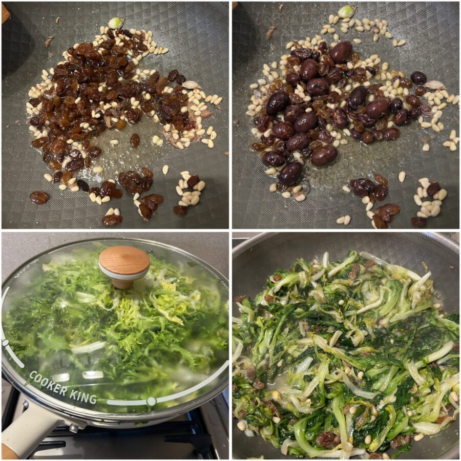 Wascht sie gründlich, entfernt die härteren Teile und zupft sie grob mit den Händen auseinander. Erhitzt in einer großen Pfanne einen Schuss extra natives Olivenöl, gebt die Knoblauchzehe und die Sardellenfilets hinzu. Lasst die Sardellen langsam zerfallen und gebt die Pinienkerne sowie danach Rosinen und Oliven dazu.
