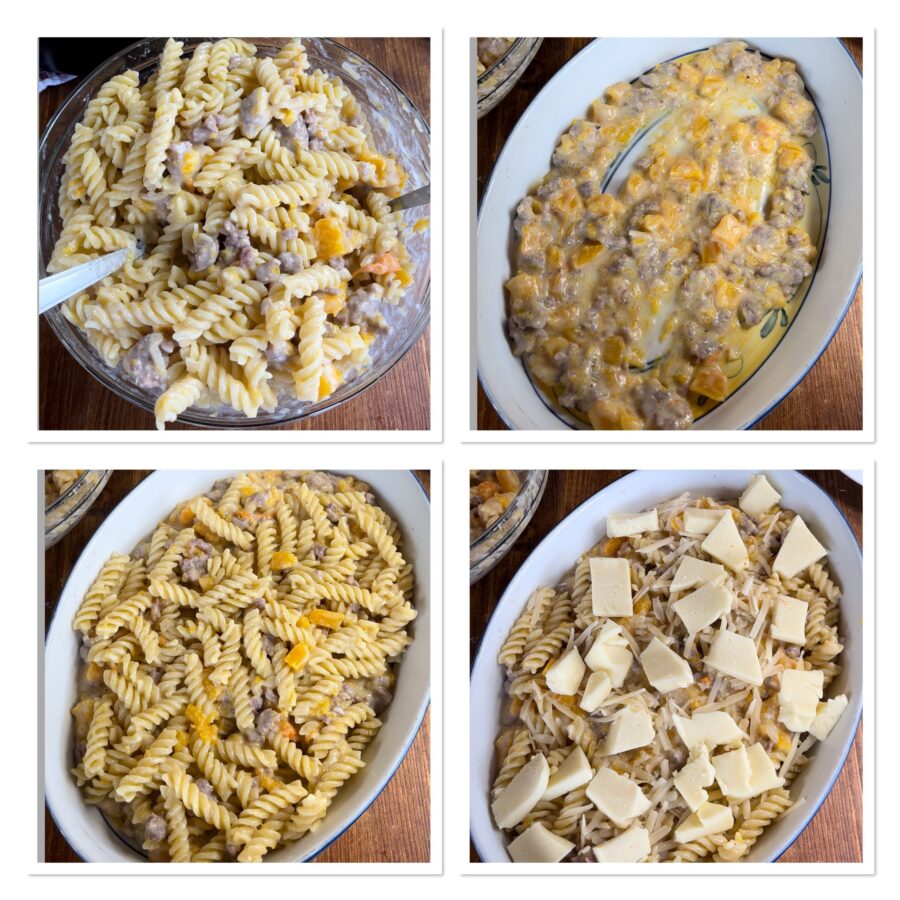 • Mit weiterer Pasta bedecken, nochmals Sauce, Parmesan, Käsewürfel und zum Schluss den beiseitegelegten Kürbis mit Salsiccia darüber verteilen.