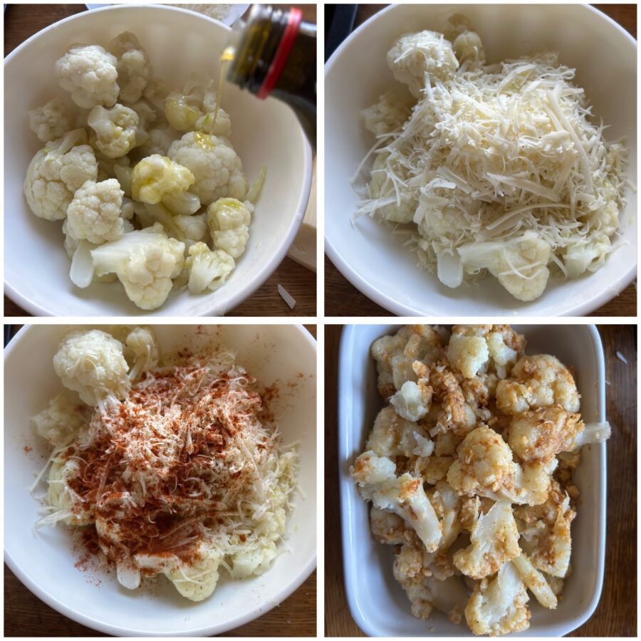 Den Blumenkohl putzen: Die Röschen voneinander trennen, kurz abspülen und in reichlich leicht gesalzenem Wasser bissfest kochen. Noch leicht al dente abgießen und in eine Schüssel geben. Einen großzügigen Schuss Öl, den geriebenen Grana, die Semmelbrösel sowie Pfeffer und Paprikapulver hinzufügen.