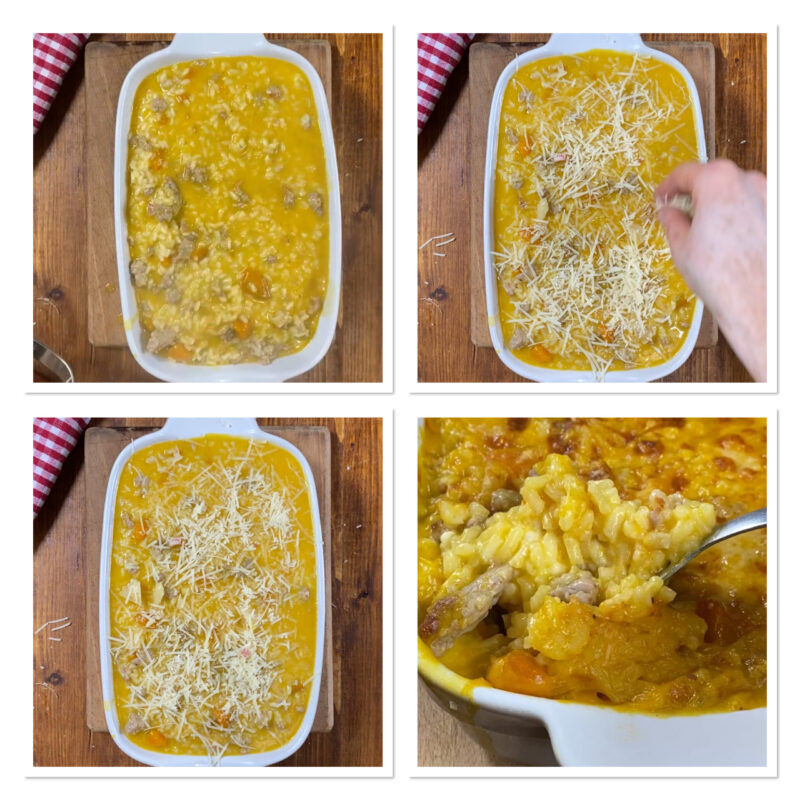 Überbackener Ofenrisotto mit Käse, Kürbis und Salsiccia: Zubereitung…