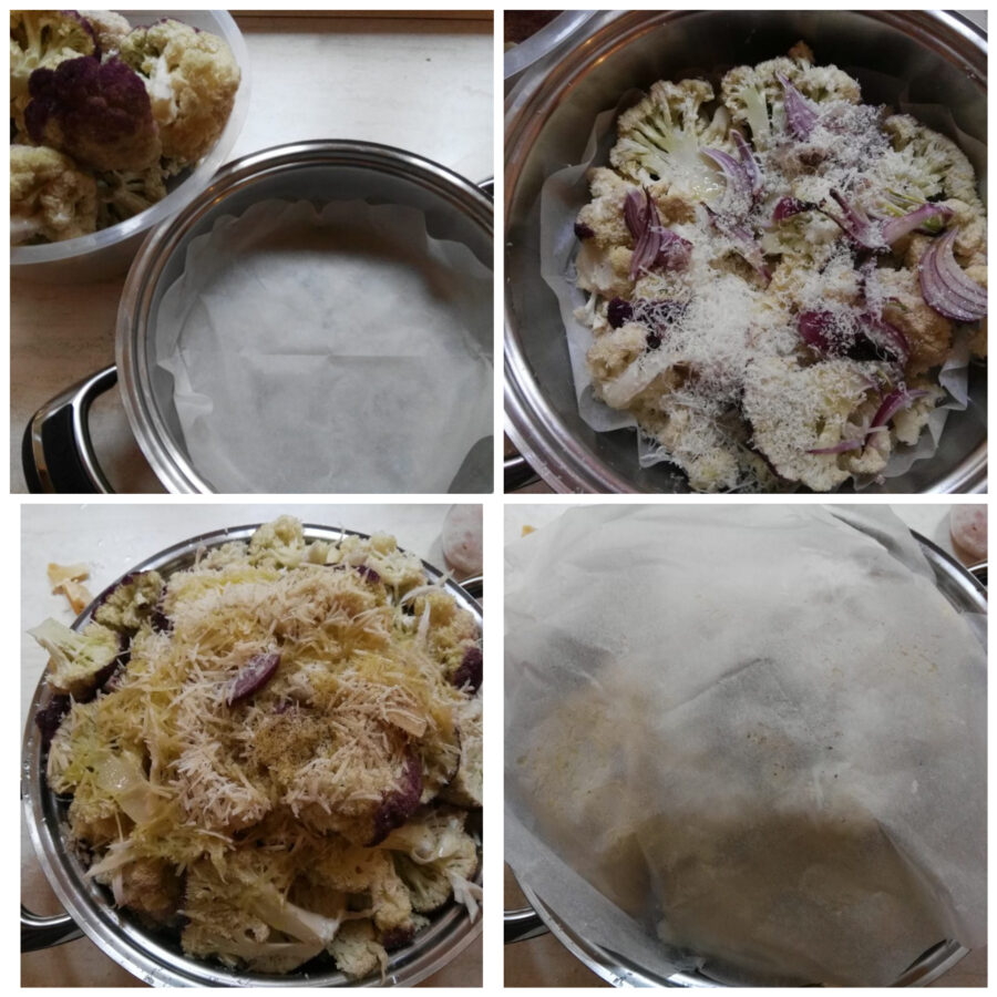 • und so als würdet ihr eine Omelette wenden, lasst sie vorsichtig zurück in den Topf gleiten, in dem noch Backpapier auf dem Boden liegt. Gießt das andere halbe Glas Wein hinein und deckt wieder mit Backpapier und einem Teller ab. Siehe Foto. Ihr müsst den Vorgang des Wendens der Blumenkohlstücke mindestens noch zwei Mal wiederholen, stets ohne sie zu zerstören und ohne weiteren Wein hinzuzufügen.