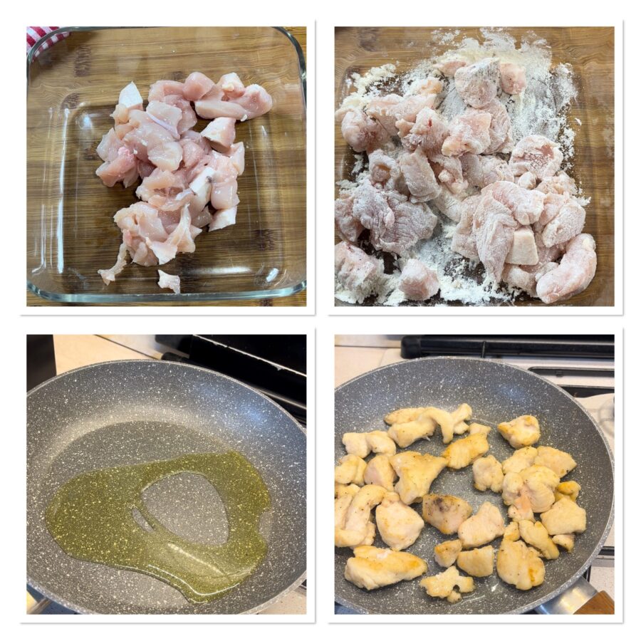 Während die Erbsen garen, das Hähnchen in Stücke schneiden und in Mehl (Type 0 oder 00) wälzen, oder die Scheiben mehlieren; mit Salz und Pfeffer würzen.