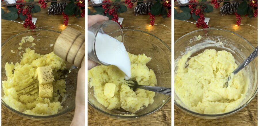 • Salz, Pfeffer und Butter unterrühren und nach und nach die Milch zugeben, bis ein cremiges, aber standfestes Püree entsteht.