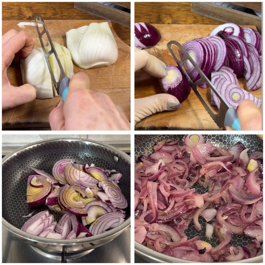 • Für die Fenchel-Caponata beginnt ihr damit, den Fenchel abzuspülen, das „Bärtchen“ und die äußeren Blätter zu entfernen, ihn halbiert und in dünne Scheiben zu schneiden. Die Zwiebel schälen und ebenfalls in Scheiben schneiden. Gebt die Zwiebel in eine große Pfanne und lasst sie bei etwas Öl und einer Prise Salz langsam weich werden.