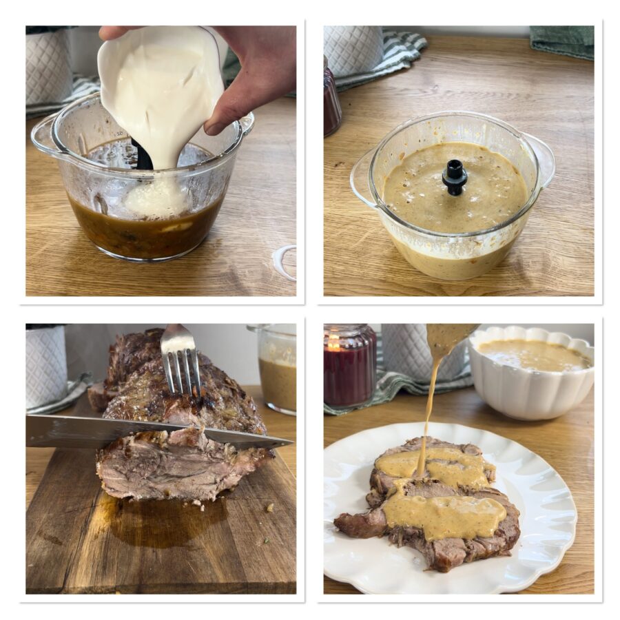 Gebt den Bratensatz in den Mixer und fügt die Sahne hinzu. Püriert alles, um die Begleitsauce zu erhalten.