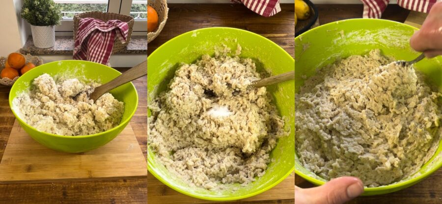 • Vermischt alles in Schüsseln, gebt das Vanillearoma oder das Vanillin hinzu, rührt gut um und lasst die Mischung im ausgeschalteten Ofen mit eingeschalteter Lampe 45–60 Minuten ruhen, damit sie geht.