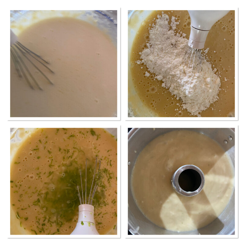 • Gießt die heiße Milch dazu (die heiße Flüssigkeit wird sofort vom Mehl aufgenommen; indem es die Feuchtigkeit einbindet, bleibt der Kuchen länger weich), fügt die Stärke, das Backpulver, das Vanillin, die Schale einer Zitrone und den Saft hinzu, vermengt alles gut und gebt den Teig in eine gefettete oder bemehlte Form mit 24 cm Durchmesser.