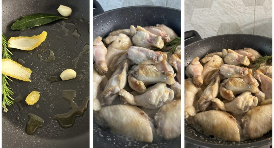 • Beginnt mit der Zubereitung: Gebt Rosmarin, Lorbeer, eine halbierte Knoblauchzehe, zwei oder drei Stücke Zitronenschale (Bio) und einen Schuss Öl in eine große Pfanne. Erhitzt alles bei schwacher Hitze und legt die Flügel hinein. Dann die Hitze erhöhen und die Flügel von beiden Seiten goldbraun braten, dabei häufig wenden; anschließend den Wein zugießen (Foto fehlt).