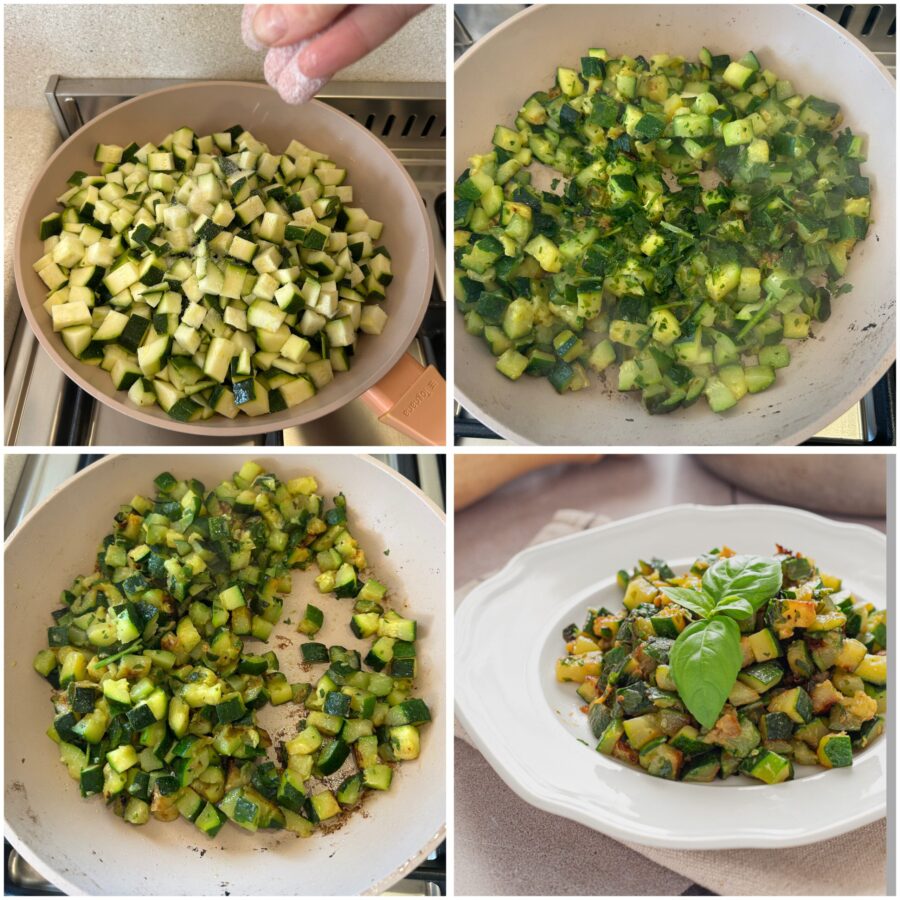Damit die Zucchini lecker und nicht wässrig werden, ist es wichtig, eine große Pfanne zu verwenden und sie nicht zu überladen: die Zucchini sollen braten, nicht kochen.