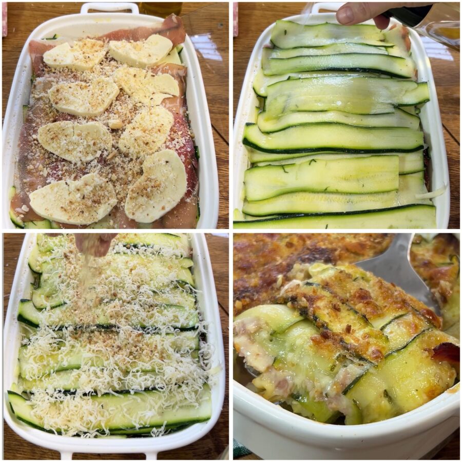 Für dieses Rezept müssen die Zucchini nicht vorgegart werden; verwendet werden sie roh, nur sehr dünn geschnitten mit einer Mandoline oder einem Sparschäler. Schichtet sie abwechselnd mit den Belägen und dann direkt in den Ofen – ohne zusätzliches Salz und mit sehr wenig Öl. Neugierig? Dann folgt mir in die Küche, wir bereiten sie zusammen zu. Wenn ihr weitere köstliche Zucchini-Rezepte probieren möchtet, versucht die Gegrillte Zucchini-Salat oder die Pasta mit Thunfisch und Zucchini. Ich erinnere euch: Wenn ihr über meine Rezepte auf dem Laufenden bleiben wollt, folgt meiner Facebook-Seite (hier) und meinem Instagram-Profil (hier).