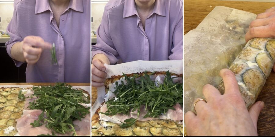 Gebt, wenn ihr mögt, etwas Rucola dazu und rollt mit Hilfe des Backpapiers alles zu einer Rolle, die im Papier eingewickelt bleibt. Stellt sie eine Stunde in den Kühlschrank. Entfernt dann das Papier, schneidet die Enden ab (die könnt ihr sofort essen) und richtet die Rolle auf einer Platte an.
