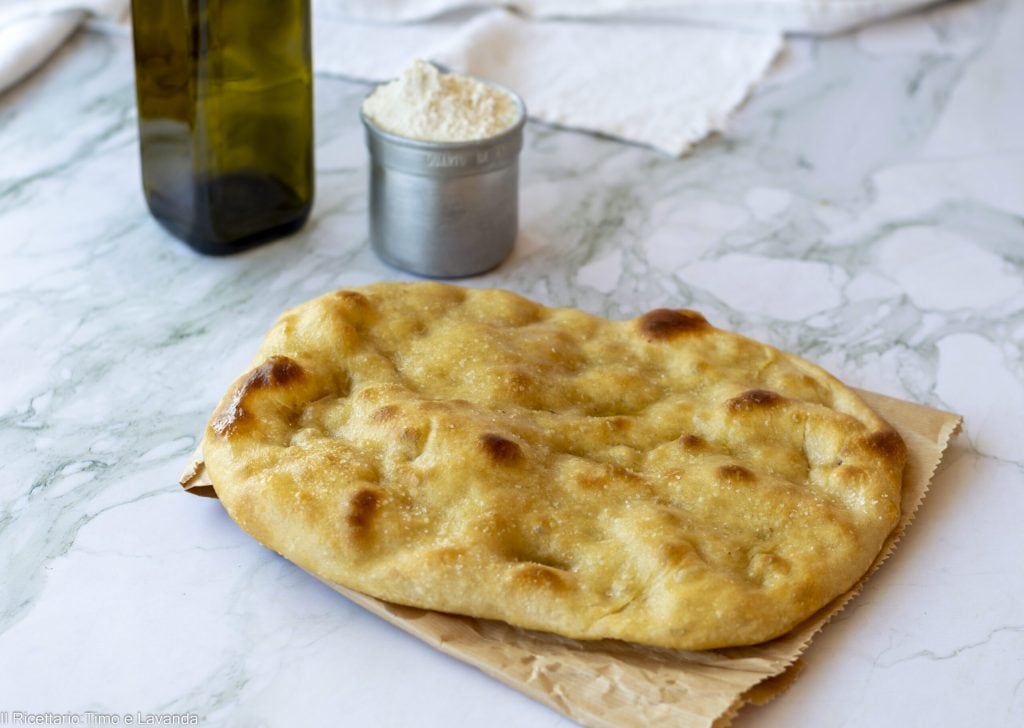 Diese Focaccia mit getrocknetem Sauerteig habe ich mit dem „getrockneten Sauerteig mit Hefe“ zubereitet, den mir Ruggeri Mehle freundlicherweise geschenkt hat. Ein wirklich außergewöhnliches Produkt, das intensive Aromen verleiht, ähnlich wie lebendiger Sauerteig, mit dem Unterschied, dass dieser nicht aufgefrischt werden muss und daher einfacher zu verwenden und aufzubewahren ist. Es kann für alle Brotsorten, Pizza, Focaccia und auch große Hefegebäcke verwendet werden. Die Zubereitung dieser Focaccia ist sehr einfach und erfordert keine besonderen Maßnahmen. Die angegebene Menge ist für eine Gärung im Kühlschrank gedacht, man knetet sie am Abend vorher, alternativ kann man 40 g mehr Hefe hinzufügen und sie am Nachmittag kneten, um sie zum Abendessen zu genießen. Außen knusprig und innen weich kann sie auch gefüllt werden.