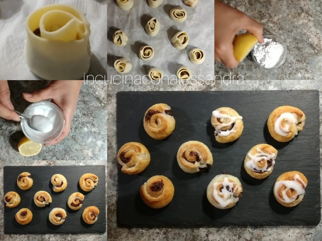 Blätterteig mit einem Rädchen in Streifen schneiden, eine Seite mit der Creme füllen, dann den Blätterteig von der Cremeseite her umklappen, etwa bis zur Hälfte des Streifens. Dann den Streifen auf sich selbst aufrollen und seitlich mit etwas Wasser oder geschlagenem Eigelb verschließen. Mit allen Streifen gleich verfahren, auf ein mit Backpapier ausgelegtes Blech legen und im vorgeheizten Ofen bei 180° für 10/12 Minuten backen. Während die Röschen backen, den Guss vorbereiten: In einer kleinen Schüssel Puderzucker mit ein paar Tropfen Zitronensaft mischen, er sollte ziemlich dick sein, ich empfehle, 2/3 Tropfen auf einmal hinzuzufügen, bis die gewünschte Konsistenz erreicht ist. Wenn sie gebacken sind, vor dem Auftragen des Gusses abkühlen lassen. Wenn Sie den Zitronengeschmack nicht mögen, können Sie die Hälfte Zitronensaft und die Hälfte Wasser verwenden.