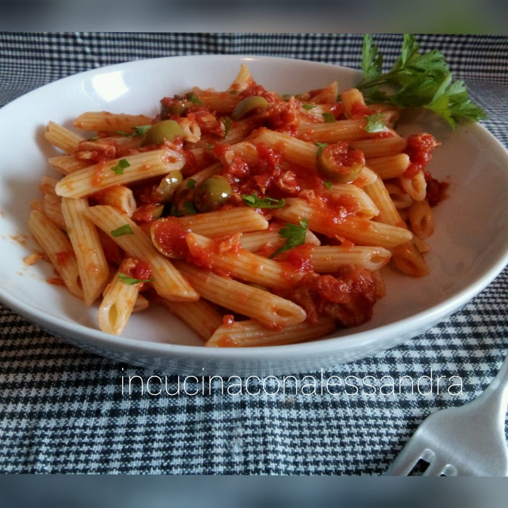 Passata und Oliven normalerweise immer im Haus sind. Es ist ein einfaches und schnelles Gericht, während Sie das Wasser aufsetzen und die Pasta kochen … bereiten Sie die Sauce zu.