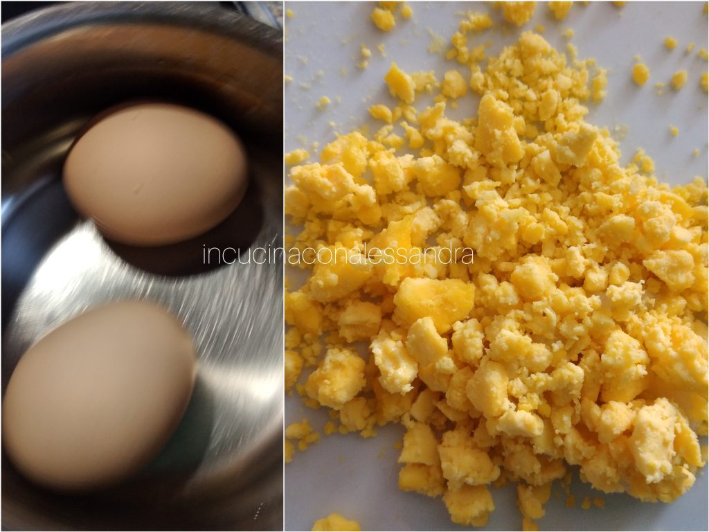 Zuerst die Gemüsebrühe zubereiten und die Eier in kochendem Wasser kochen, sie müssen hart werden. Sobald sie abgekühlt sind, die Schale und das Eiweiß entfernen und die Eigelbe zerbröseln.
