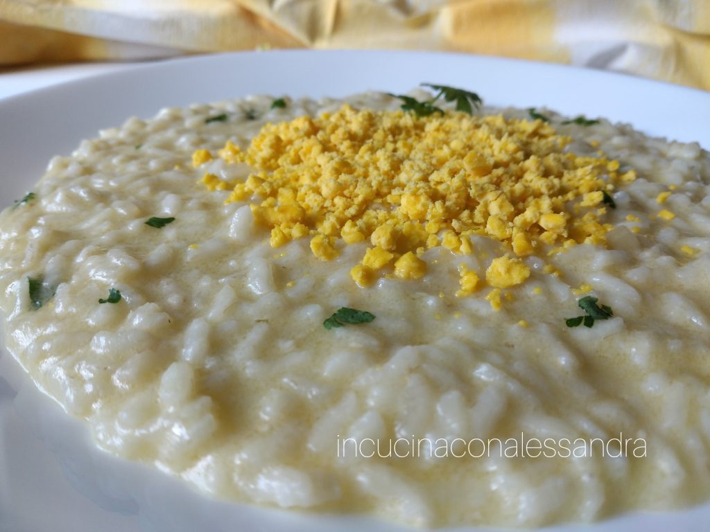 Mimosenrisotto mit Parmesan, ein Risotto mit einer einfachen Creme aus Butter und geriebenem Parmesan, mit zerbröckeltem hartgekochtem Eigelb, um den Mimoseneffekt zu erzeugen. Ein einfach zuzubereitendes Hauptgericht, perfekt für den Frauentag.