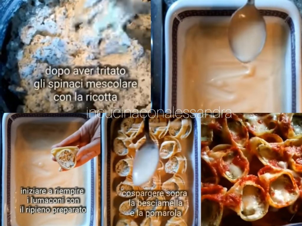Zuerst einen Topf mit Wasser auf den Herd stellen, wenn es kocht, die Lumaconi hineingeben und etwa 5 Minuten kochen lassen, sie sollen nur weich werden, die Garzeit wird im Ofen abgeschlossen. Bereiten Sie die Béchamelsauce zu, erhitzen Sie die Milch, in einem anderen Topf die Butter schmelzen, das Maisstärke einrühren, schnell mit einem Holzlöffel rühren, es wird eine Mehlschwitze, rühren, bis es sich von den Rändern löst. An diesem Punkt einen kleinen Teil der heißen Milch einfüllen und gut umrühren, bis alles aufgelöst ist, die restliche Milch einfüllen, wieder auf den Herd stellen und rühren, wenn es kocht, die Hitze reduzieren und weiter kochen, immer rühren, bis es eindickt. Vom Herd nehmen und Salz und Muskatnuss hinzufügen, das vollständige Verfahren finden Sie auf dem Blog. Ich habe den fertigen Spinat verwendet, um Zeit zu sparen, aber Sie können auch frischen kochen. Den Spinat in einer Schüssel fein hacken, die abgetropfte Ricotta hinzufügen, mit einer Gabel zerdrücken, salzen und gut vermischen. Eine Auflaufform einfetten und eine Schicht Béchamelsauce darauf geben, beginnen Sie, die Lumaconi mit der vorbereiteten Füllung zu füllen, in die Auflaufform mit der Füllung nach oben legen, sonst läuft es aus, mit gewürzter Tomatensauce (ich habe Pomarola verwendet) und Béchamelsauce würzen, mit Parmesan bestreuen und im heißen Ofen bei 180° etwa 10-12 Minuten backen. Die Lumaconi sind bereit, um genossen zu werden.