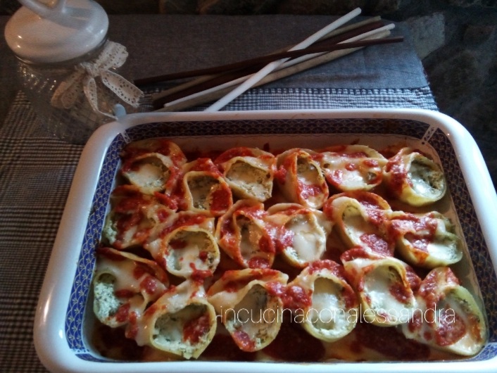 Heute habe ich ein sehr schmackhaftes Ofenpasta-Gericht zubereitet. Mit Ricotta und Spinat gefüllte Lumaconi. Ein Rezept mit mehreren Schritten, aber sehr einfach und vor allem sehr reichhaltig, ein vegetarisches Rezept. Ich habe mit Bronze gezogene Pasta verwendet.