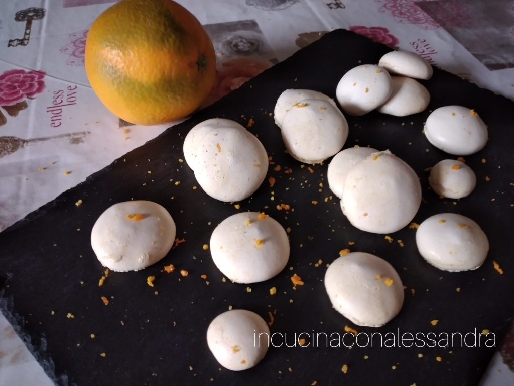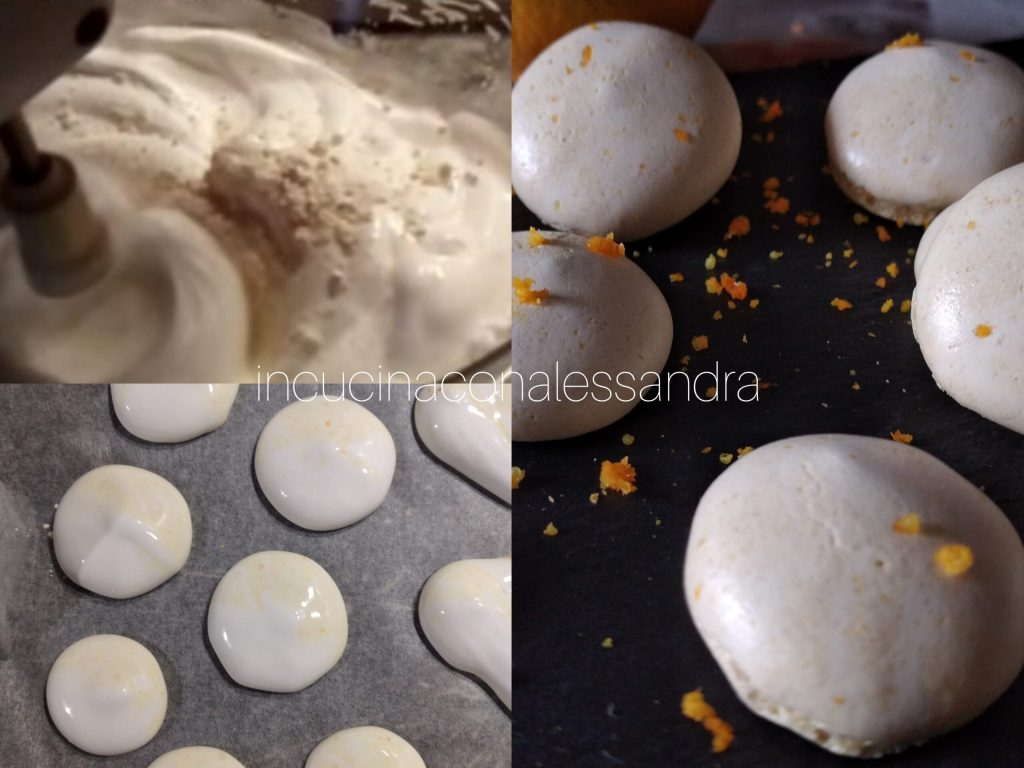 Die Baisermasse in einen Spritzbeutel mit klassischer Tülle füllen. Ein Backblech mit Backpapier auslegen und die Baisers darauf setzen, bei 100 °C für 70/80 Minuten backen. Beim Servieren ein wenig geriebene Orangenschale darübergeben.