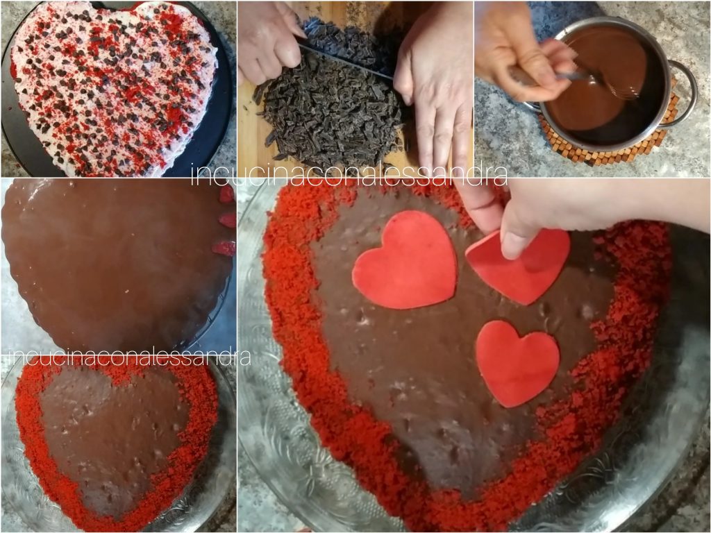 Die Milch erhitzen und vor dem Kochen ausschalten, die gehackte Zartbitterschokolade hineingeben und gut mischen. Sobald sie geschmolzen ist, den ganzen Kuchen damit überziehen, den beiseitegelegten zerbröselten Kuchen über die Ränder streuen. Den roten Fondant ausrollen und Herzen ausschneiden, um die Dekoration abzuschließen.
