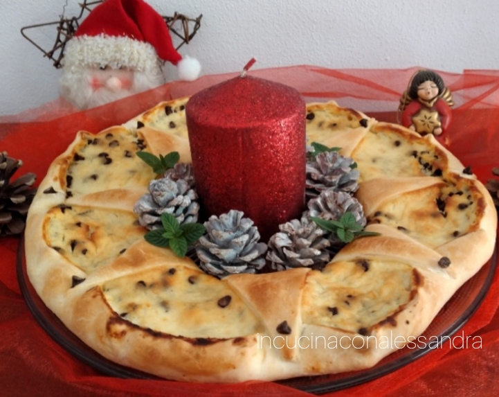 Die Ränder außen schließen, innen mit einem Messer die Teigkreise in 8 Stücke schneiden, dann die Spitze jedes Teigstücks nach außen legen und über die Creme ziehen, den gesamten Teig mit Milch bestreichen und an jeder Ecke des Teigs die Schokoladenstückchen legen, Sie können auch kandierte Früchte oder bunte Schokoladenstreusel hinzufügen. Im heißen Ofen bei 180° etwa 10/15 Minuten backen oder bis zur gewünschten Bräunung. Sobald er gebacken ist, lassen Sie ihn abkühlen und dekorieren Sie die Mitte, ich habe eine Kerze, kleine Zapfen und Minzblätter platziert.