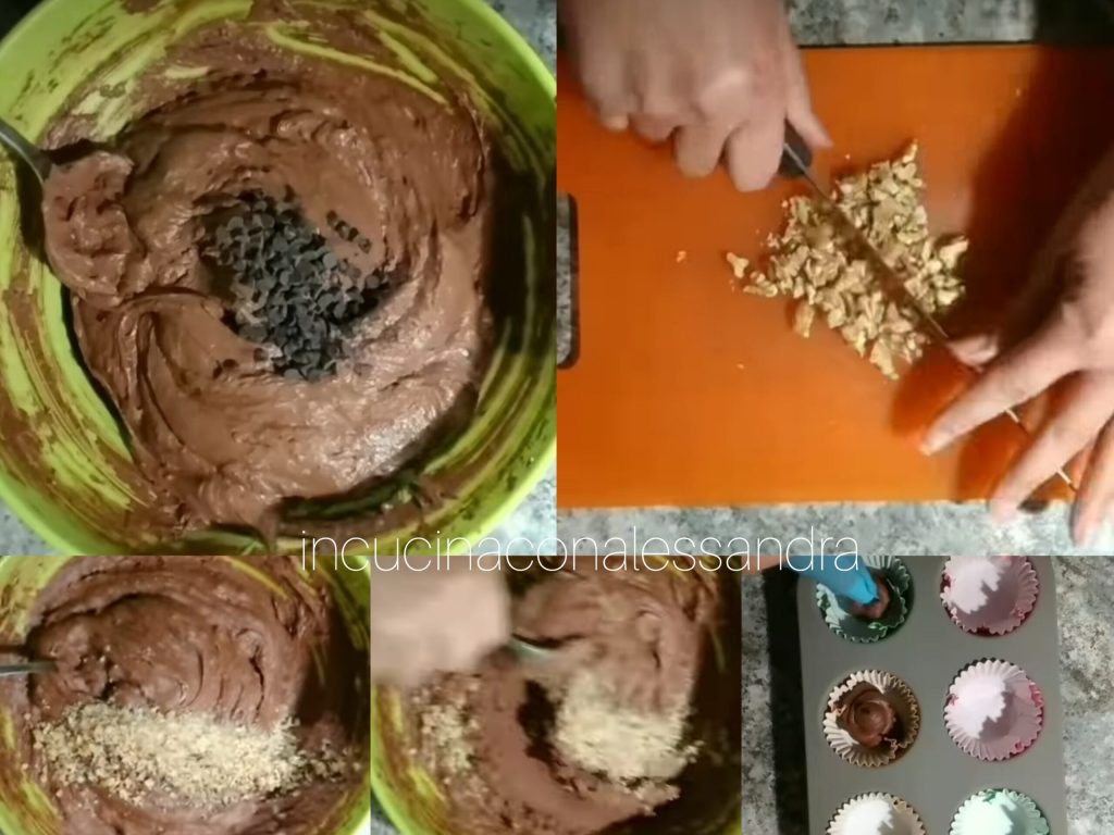 Die Schokoladenstückchen und die gehackten Walnüsse hinzufügen, dann mit einem Löffel mischen, in einen Spritzbeutel füllen und die Muffin-Förmchen füllen, in den vorgeheizten Ofen stellen und etwa 15 Minuten backen. Ihre Muffins sind bereit, genossen zu werden.