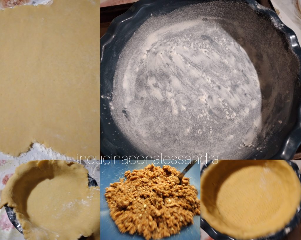 Zuerst bereiten wir den Mürbeteig vor. In eine Schüssel das Mehl, die zimmerwarme, in Stücke geschnittene Butter, den Zucker, die Prise Salz, das gesiebte Backpulver, den Vanillezucker und die Eier geben. Mit den Händen gut vermengen, wenn sich alles anfängt zu verbinden, auf eine bemehlte Arbeitsfläche geben und weiterkneten, bis ein glatter und homogener Teig entsteht. Ich bereite den Teig von Hand zu, aber wenn ihr eine Küchenmaschine habt, könnt ihr auch diese verwenden, indem ihr alle Zutaten in die Schüssel gebt und auf Stufe 2 mixt, bis sich der Teig formt. Dabei alle 2 Minuten anhalten, um die Eier und die Butter nicht zu stark zu erhitzen.
