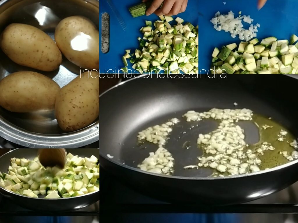 Zuerst die Kartoffeln mit der Schale und die Zucchini gut waschen, in einem Topf mit Wasser die Kartoffeln mit der Schale kochen, sie müssen gar, aber noch fest sein. Während sie kochen, die Zucchini in kleine Stücke schneiden und die Zwiebel hacken. In einer Pfanne ein wenig Öl erhitzen und die Zwiebel anbraten, dann auch die Zucchini hinzufügen, ein wenig Wasser und Salz dazugeben, mit einem Deckel abdecken und 10 Minuten kochen lassen. Wenn die Kartoffeln fertig sind, sie aus dem Wasser nehmen, 5 Minuten abkühlen lassen, dann die Schale entfernen und in eine Schüssel geben. Die gekochten Zucchini hinzufügen und mit einem Kartoffelstampfer gut zerdrücken, mit Salz abschmecken, etwas Muskatnuss reiben und das Paniermehl und die Béchamelsauce hinzufügen (die Béchamelsauce hatte ich übrig, nachdem ich Lasagne gemacht hatte, wenn ihr sie zubereiten möchtet, findet ihr mein Rezept im Blog, ansonsten geht auch die fertige), alles gut vermischen, eine Auflaufform nehmen, den Boden mit etwas Paniermehl bedecken, die vorbereitete Masse hineingeben und glatt streichen, eine Schicht Paniermehl, eine Schicht geriebenen Parmesan und dann noch ein wenig Paniermehl darüber streuen, im vorgeheizten Ofen backen und mindestens 20 Minuten oder bis zur gewünschten Bräune backen.